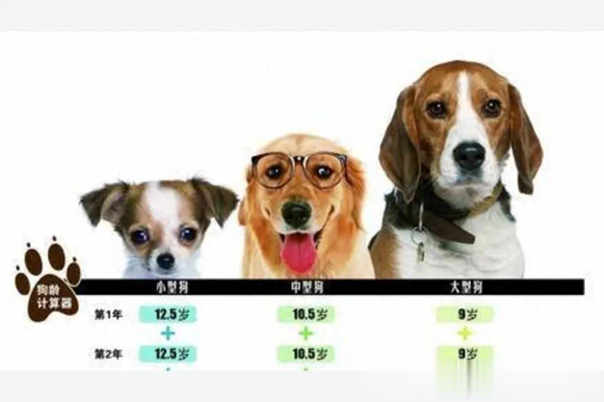 表格对照换算: 小型犬:1岁时相当于人类的15岁,2岁相当于24岁,此后每增长1岁,相当于人类增长4-5岁,如10岁的小型犬相当于人类的56岁左右。中型犬:1岁相当于人类的15岁,2岁相当于23岁,之后每增加1岁,相当于人类增加4-5岁,例如8岁的中型犬约相当于人类的51岁。大型犬:1岁相当于人类的15岁,2岁相当于22岁,后续每长1岁,约相当于人类长4-5岁,像7岁的大型犬大概相当于人类的45岁。