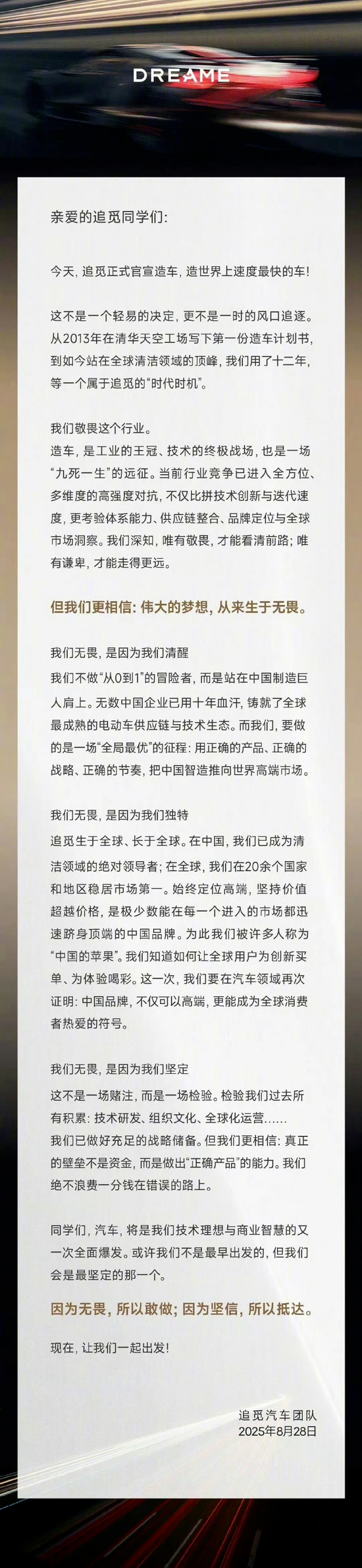 新能源造车领域迎来又一位重磅跨界玩家——8月28日,以智能清洁家电知名的追觅科技正式官宣进军汽车行业,首款超豪华纯电产品将直接对标布加迪威龙,预计2027年亮相。追觅方面强调将长期投入汽车领域,目前已组建近千人研发生产团队,持续扩大规模。值得注意的是,截至2024年底,追觅全球专利申请量达6379件,其中发明专利占比45%,覆盖传感器融合、电机控制、人机交互等智能汽车核心技术,显示出其深厚的技术积淀与AI算法底蕴。